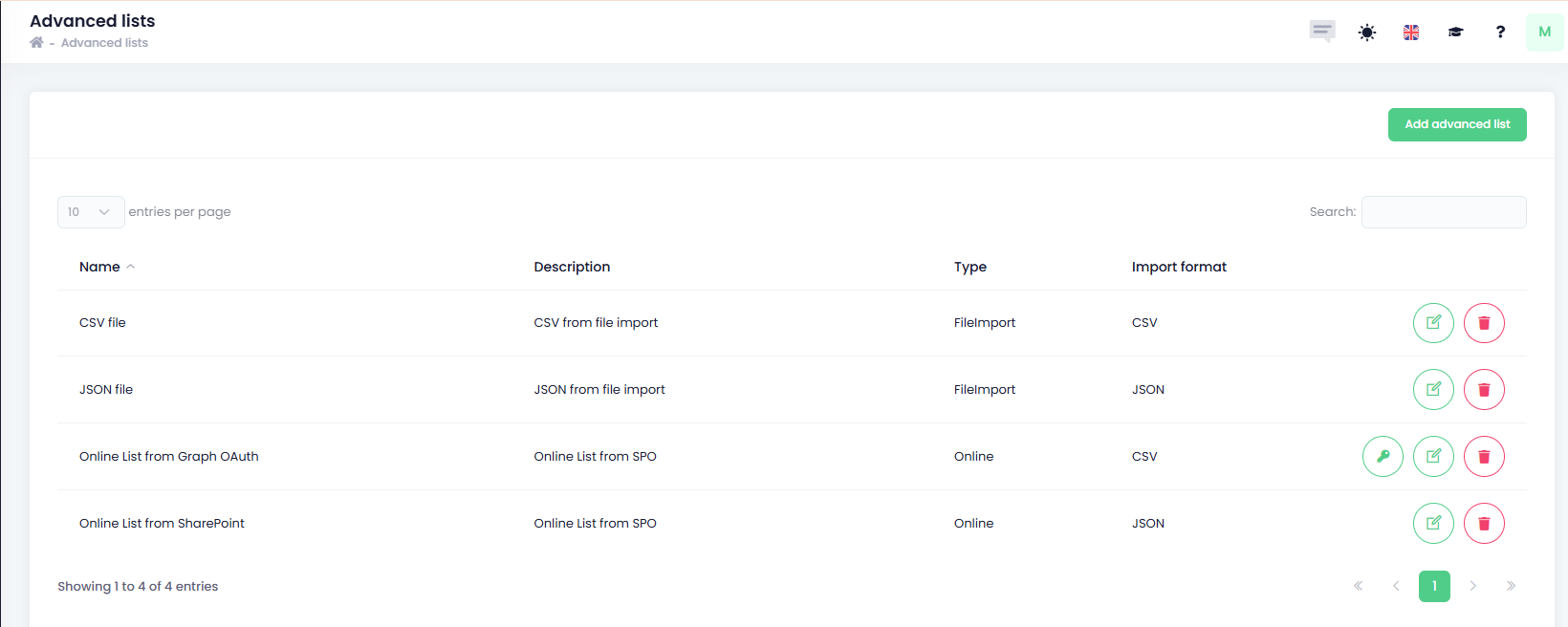Advanced lists allow you to configure and import lists from various sources, these lists can be static from file import, loaded from URL or online. All options are described is separate chapters.