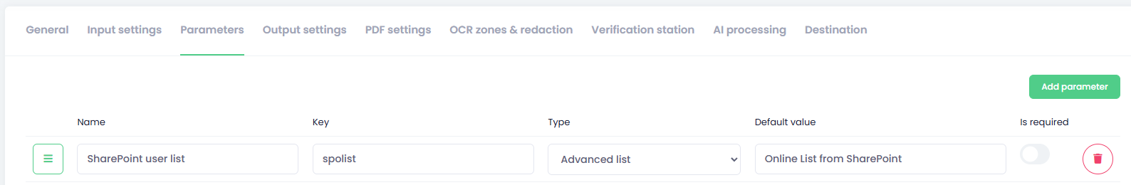 On the parameters tab, select the Advanced list type and in Default value field select the desired Advanced list you created in Advanced lists section. Enter the parameter name and key as usual.