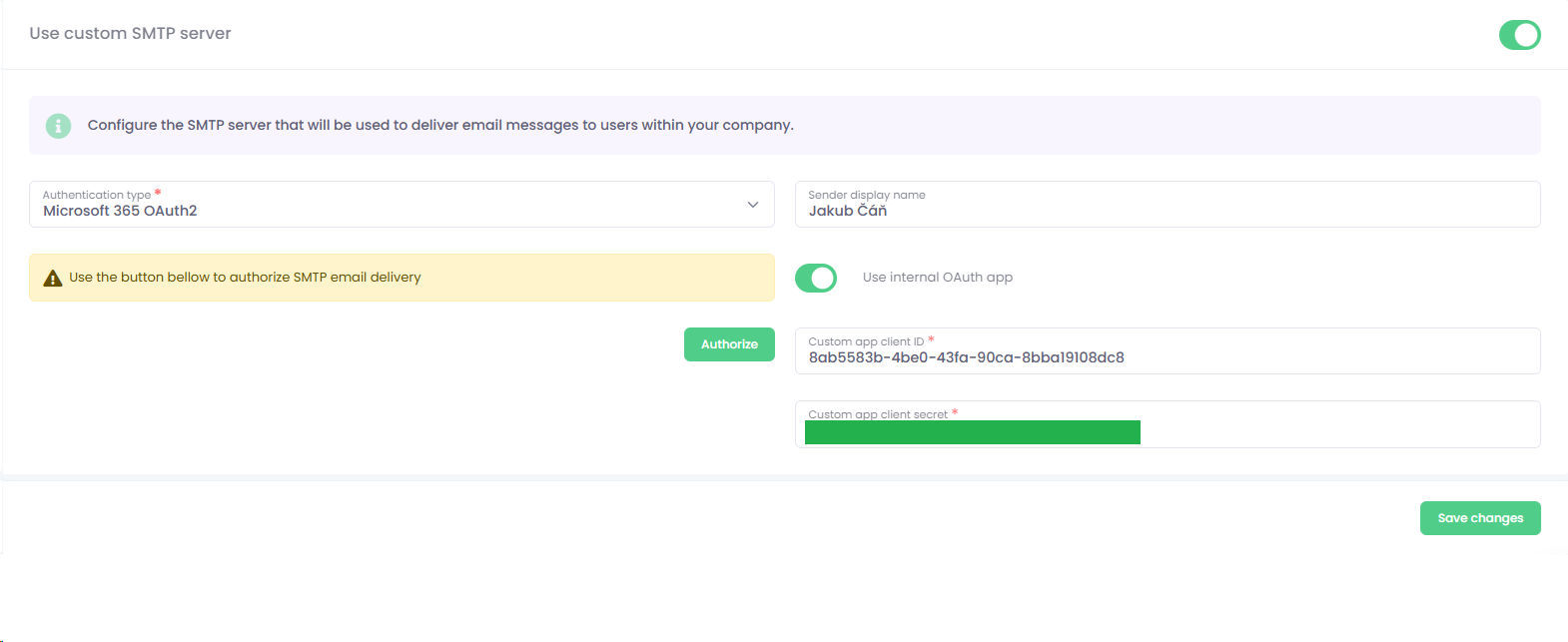 5. Copy secret value and application Client ID and paste them into according field in SMTP configuration.