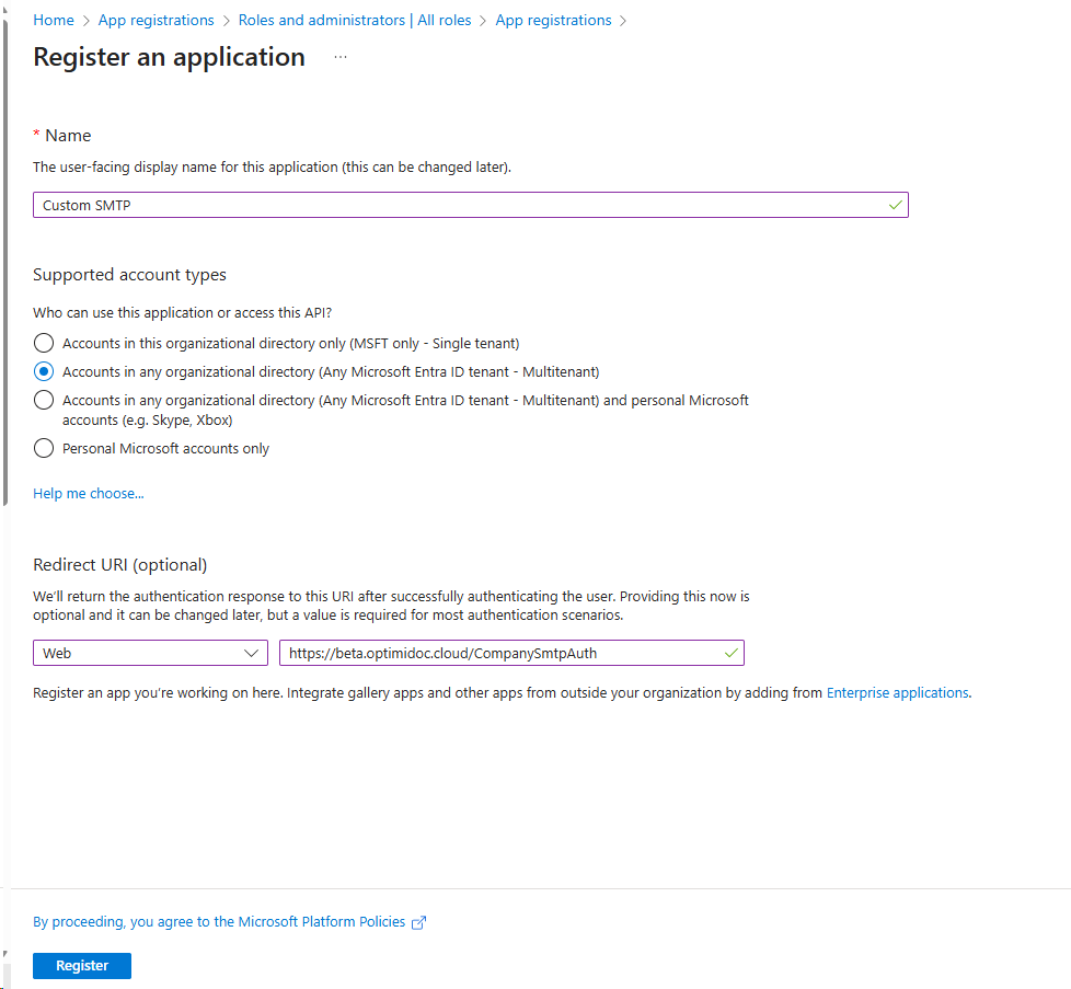 3. Enter the application name, select Multitenant account type and Redirect URI: https://beta.optimidoc.cloud/CompanySmtpAuth